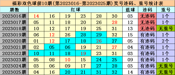 开出1-2次的红球号码(20个):01、02、03、06、08、10、11、13、14、15、16、17、21、23、24、25、27、28、31、32;