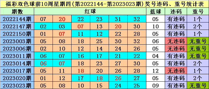 双色球前10周星期四(第2022144-第2023023期)红球号码频次统计: