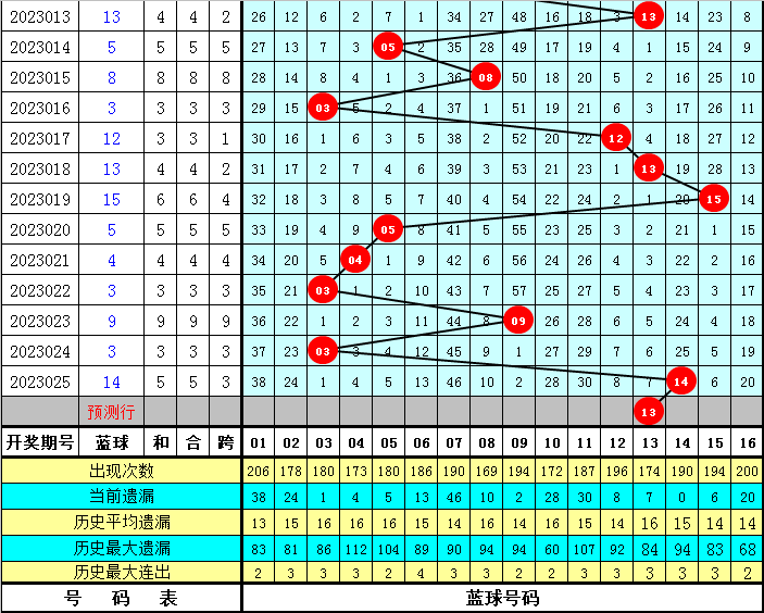 蓝球:最近10期开出8个蓝球,其中号码012路比为6:2:2,奇偶比为7:3,大小比为5:5。